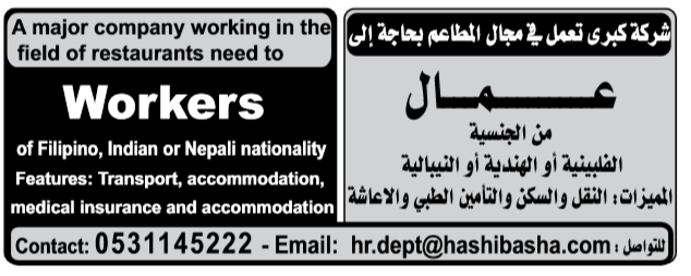 منصة الوسيلة الإعلانية شركة كبرى تعمل في مجال إدارة و تشغيل المطاعم تطلب موظفين للعمل في أحد فروعها