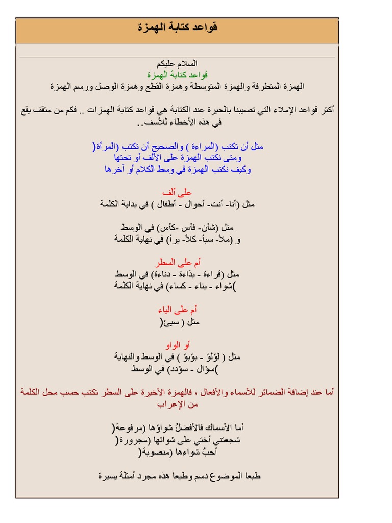 مواضع الهمزة فى ورقة كل مواضع وقواعد رسم الهمزة فى ورقة واحدة فقط هامة لكل طالب
