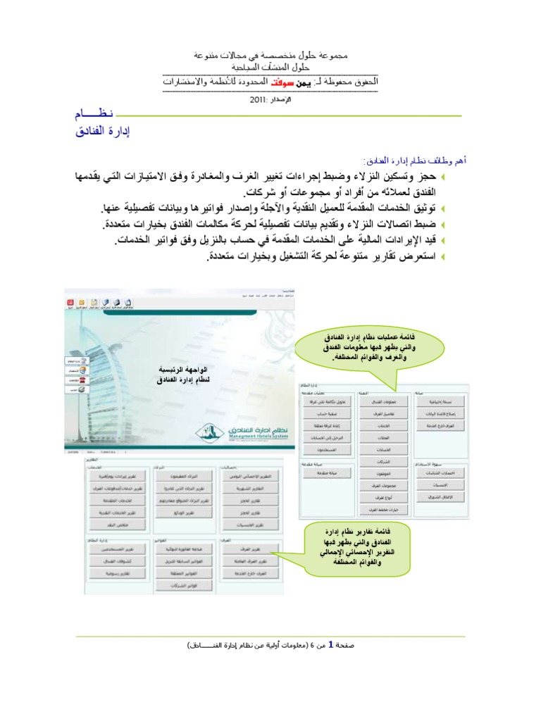 نظام ادارة الفنادق pdf. Email protected عرض الباقة المتكاملة لتصميم المواقع اسعار تصميم المواقع فى شركة مارسيليا لتصميم المواقع. نظام متكامل وشامل لإدارة الفنادق مبني على أعلى المعايير العالمية لمهنة الضيافة. نظام إدارة الفنادق يتيح البرنامج إدارة كاملة لكافة أعمال قسم الاستقبال وما يتعلق بها و يقدم معلومات تفصيلية حول وضع الغرف والحجوزات أو المجموعات والمكاتب السياحية التي توفد نزلاء إلى الفندق ويتميز بكثير من الخصائص. نظام ادارة الفنادق فرصة التحول لمنشاة سياحية متميزة by yemensoft in types brochures and حلول المنشات السياحية من يمن سوفت.